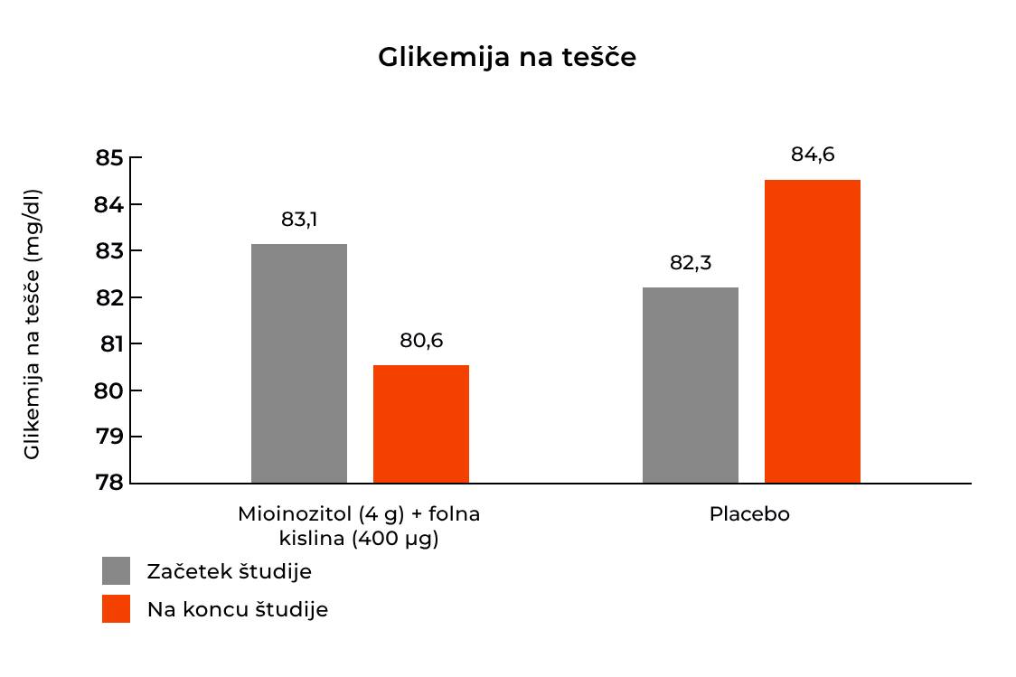 Nato so merjenje ponovili pred koncem nosečnosti. Pokazalo se je, da je bila v skupini, ki je dnevno jemala mioinozitol, raven glikemije na tešče ob koncu nosečnosti za 3% nižja kot v prvem trimesečju. Nasprotno pa je bila pri ženskah v skupini s placebom v povprečju celo višja kot na začetku zdravljenja. Poleg tega se je indeks HOMA-IR v skupini z mioinozitolom v povprečju znižal za 30%. [3]