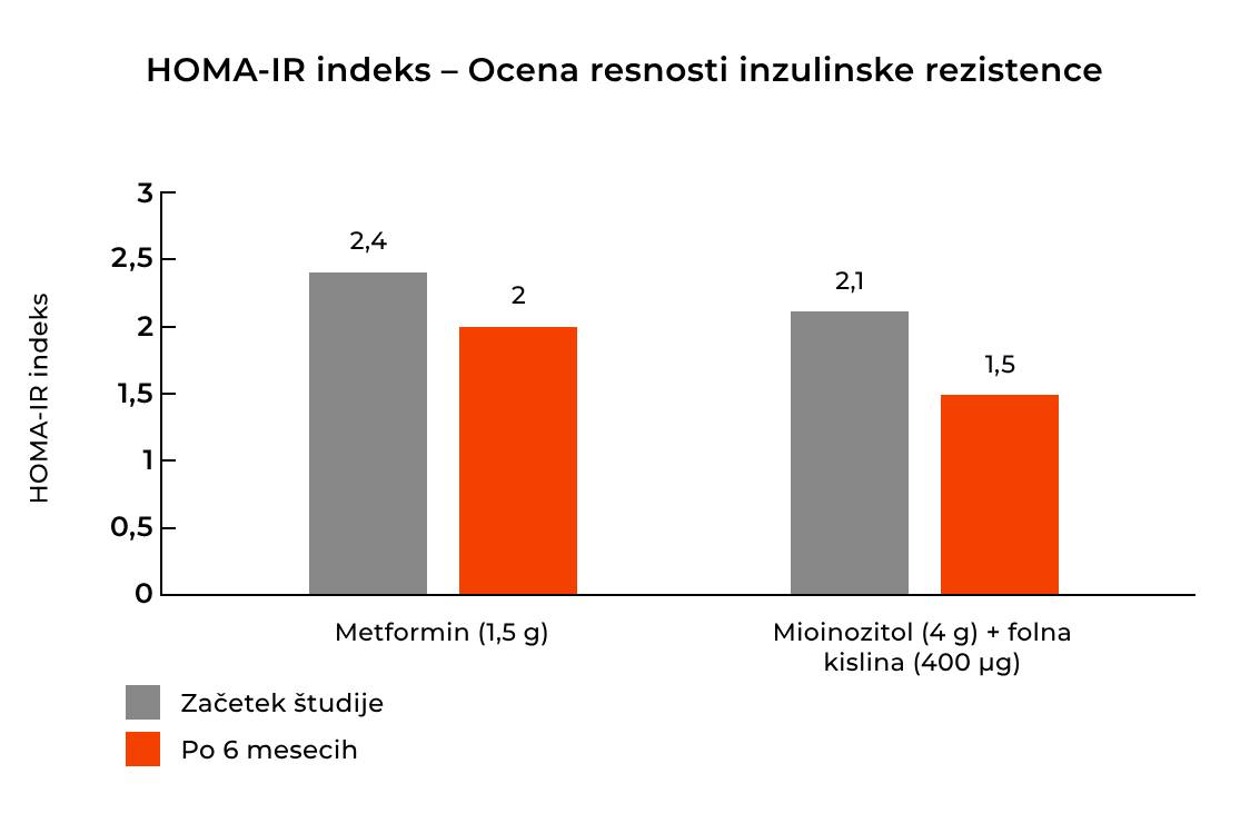 • Indeks HOMA-IR se je pri metforminu zmanjšal za 16,7%, pri inozitolom pa za 28,6%. [6]
