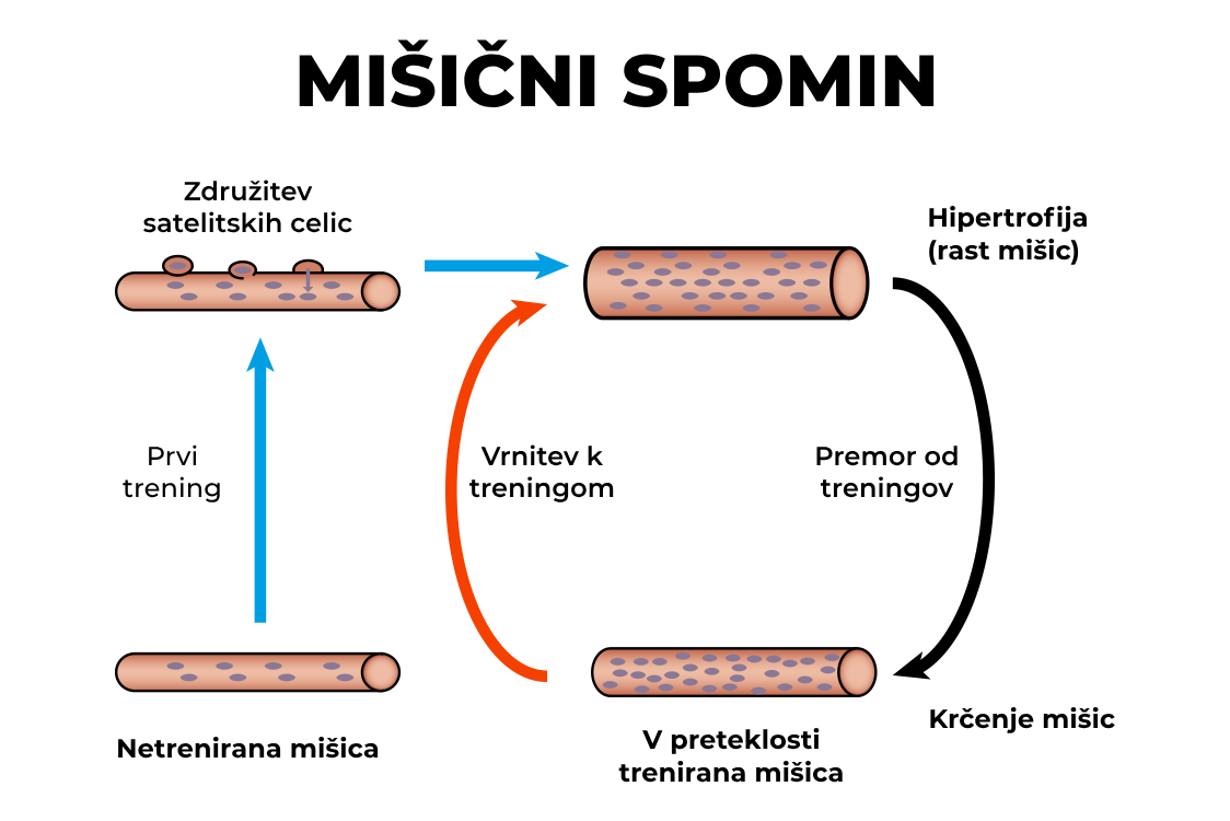 Ko se vrnete k vadbi, imajo mišice vnaprej pripravljena celična jedra, ki lahko veliko hitreje proizvajajo beljakovine kot ob vašem prvem začetku vadbe. Povratek v prvotno formo in pridobivanje mišične mase je tako veliko hitrejši zaradi prvotnih jeder mišičnih vlaken. Glede na vrsto športa, prejšnjo vadbo in individualne razlike (genetika) se lahko prvotna postava vrne že v nekaj tednih. Tudi tokrat pa je pomembno, da obremenitev postopoma povečujete. Zaradi mišičnega spomina je tudi sama regeneracija boljša, kar pomeni, da bi mišična bolečina morala biti bolj znosna.