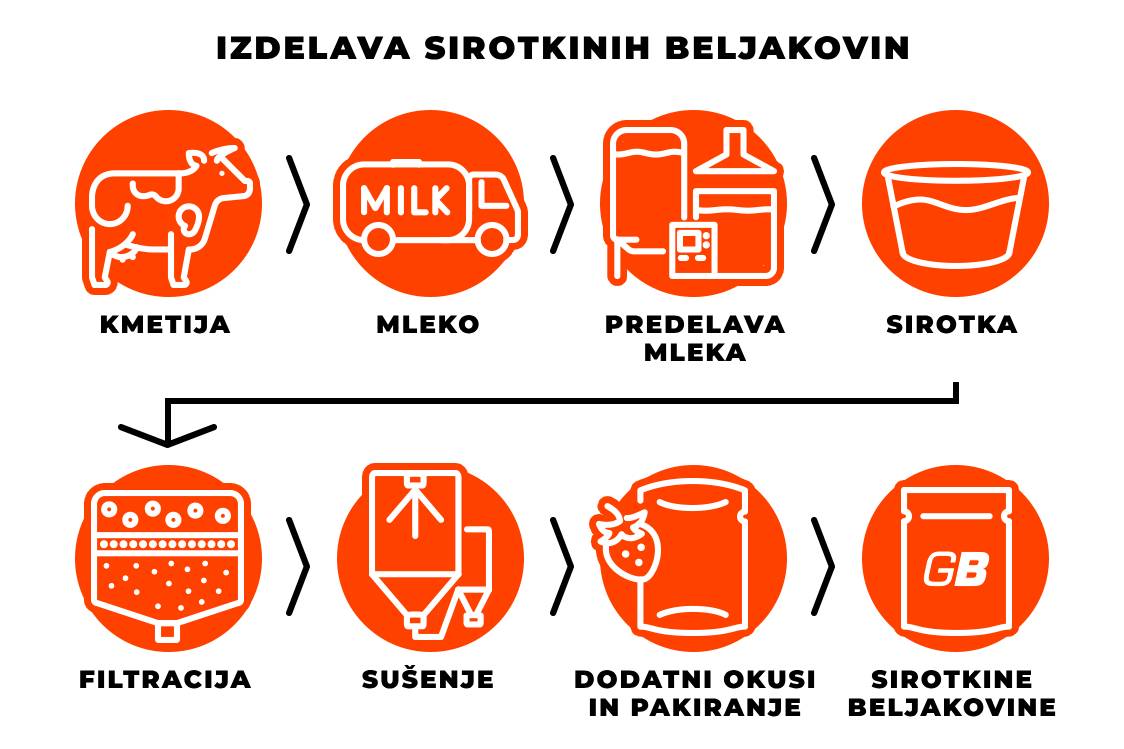Pot sirotkinih beljakovin se začne na mlečni farmi, kjer se mleko iztisne in nato potuje v predelovalni obrat. Tam se doda sirilo in mleko se nato loči na tekočo sirotko in trdne snovi. Preden sirotka postane, na primer, priljubljena čokoladna beljakovina v prahu, mora preiti še več korakov. Sirotkine beljakovine se ločijo, koncentrirajo in posušijo. Nato se dodajo arome, sladila ali druge sestavine. Na koncu se vse skupaj zapakira.
