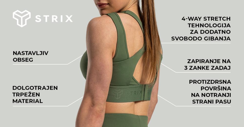 Nedrček že na prvi pogled pritegne pozornost tudi s svojim izvirnim krojem. Zanimivo oblikovan hrbet je kombiniran s klasičnimi naramnicami, kar mu daje edinstven videz, s katerim boste izstopile iz množice. Z elegantnim logotipom Strix na pasu in hrbtni strani lahko vsem pokažete svojo motivacijo za šport in vadbo.