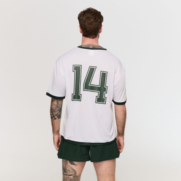 Ta zračna mrežasta majica vas bo pritegnila s svojim modernim oversized krojem s kratkimi rokavi in okroglim izrezom, ki zagotavlja, da vas pri gibanju popolnoma nič ne ovira. Študentski košarkarski stil poudarjajo obrobe na rokavih in ovratniku, dopolnjujejo pa ga drzen potisk na prsih in športna številka na hrbtu. Zaradi takšnega videza je to nepogrešljiv kos vaše športne in sproščene garderobe. Nosite jo v fitnesu, pri igranju košarke ali preprosto na potepu po mestu s prijatelji.