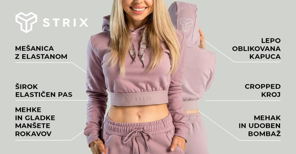Še več, ta jopica s kapuco ima sodoben prirezan kroj in minimalističen dizajn, ki ga dodatno poudarijo subtilni napisi in logotip STRIX. Popolnoma se ujema s pajkicami z visokim pasom ali hlačami za prosti čas. Nenazadnje bo krajši kroj s kapuco poudaril vaš ozek pas in vam dvignil samozavest med treningom v telovadnici, pa tudi med prostočasnimi aktivnostmi.