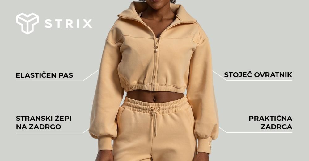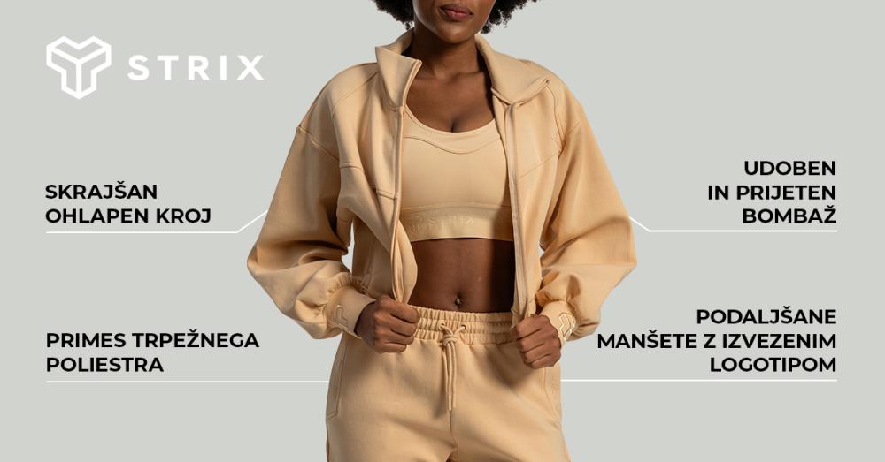 Ženska jakna z zadrgo Lunar vas bo navdušila z udobnim materialom in stiskim videzom. Izdelana je iz bombaža z mešanico poliestra in elastana. Zaradi te kombinacije materialov ni le zelo topla, ampak je tudi izjemno prijetna za kožo. Tako vam bo med nošenjem zagotovila največje udobje. Ima praktično zadrgo, visok ovratnik in dva stranska žepa, v katera lahko shranite telefon, ključe ali druge dragocenosti. Ima tudi elastični pas, ki pomaga, da ohranja obliko. Rokavi so okrašeni z logotipom STRIX, s katerim lahko svetu pokažete, da ste tudi vi del družine ljubiteljev športa. Ima ohlapnejši in krajši kroj, ki bo odlično poudaril vaše natrenirane trebušne mišice.