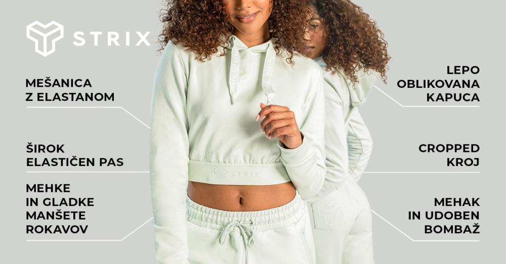 Še več, ta jopica s kapuco ima sodoben prirezan kroj in minimalističen dizajn, ki ga dodatno poudarijo subtilni napisi in logotip STRIX. Popolnoma se ujema s pajkicami z visokim pasom ali hlačami za prosti čas. Nenazadnje bo krajši kroj s kapuco poudaril vaš ozek pas in vam dvignil samozavest med treningom v telovadnici, pa tudi med prostočasnimi aktivnostmi.