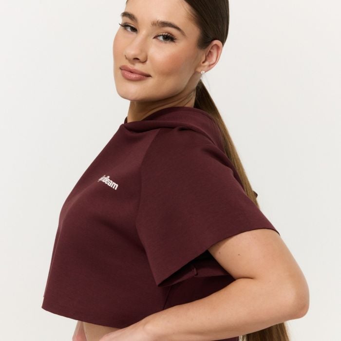 Ta kos izstopa s svojim širšim boxy krojem, ki deluje ležerno in sproščeno. Osnova dizajna vključuje raglan rokave z odrezanim učinkom in skrajšan kroj z ohlapnim zaključkom na spodnjem robu, kar majici daje rahlo uporniški pridih. Zanimiv dodatek je dvoplastna kapuca brez vrvic, ki dobro drži obliko in dopolnjuje celoten minimalističen videz tega modela.