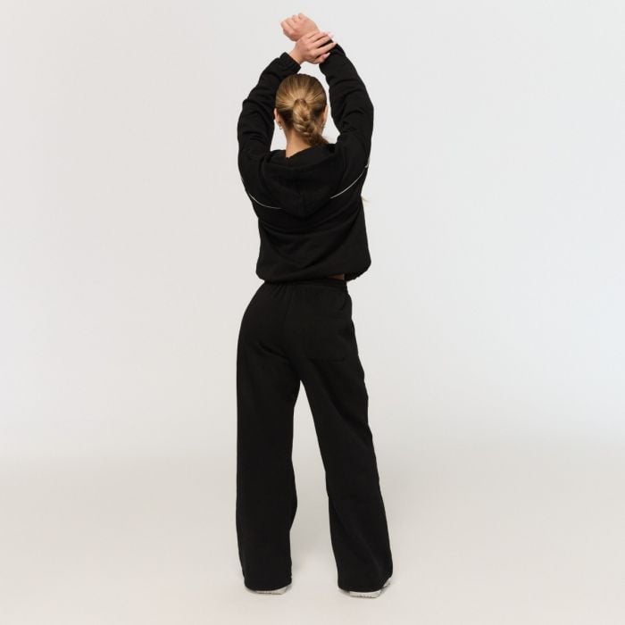 Ta spodnji del trenirke za prosti čas izstopa s prefinjenim širokim krojem hlač, ki ga zaznamujejo široke hlačnice. Na straneh so okrašene z rahlo kontrastnimi paspicami, ki optično podaljšajo noge in celotnemu kosu dodajo stilski retro pridih. Hlačnice so zaključene z vrvico z zategovalnikom, zaradi česar lahko trenirko nosite na dva načina: kot ohlapne, široke hlače ali zategnjeno pri gležnjih, da ustvarite zelo priljubljen nabran “parachute” učinek.