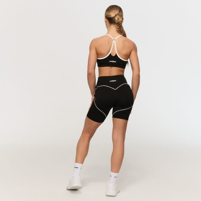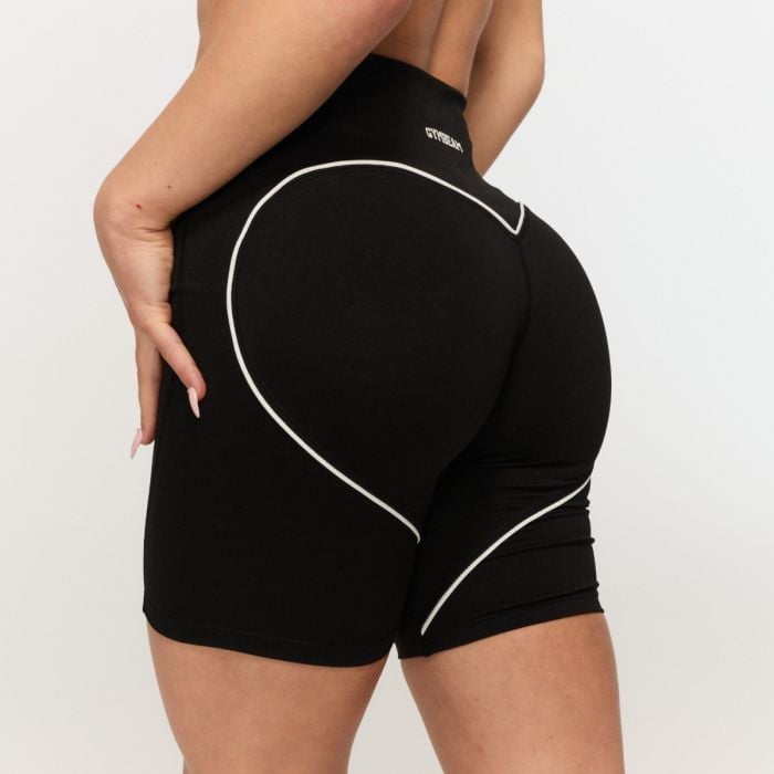 Te športne kratke hlače imajo oprijet kroj s srednjo dolžino, ki popolnoma objame vašo postavo. Visok pas z elastičnim trakom zagotavlja, da ostanejo na mestu, medtem ko je sprednji del zasnovan brez šiva za maksimalno udobje. Izstopajoča značilnost je velik, kontrastni srčasti šiv na hrbtni strani, oblikovan s tankimi belimi črtami za trendovski videz. Ta detajl optično oblikuje zadnjico, poudari vaše obline in popolno izpostavi vaš ženski čar in privlačnost.