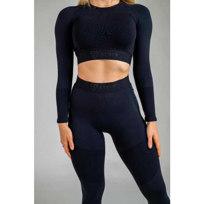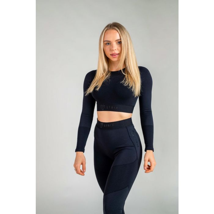 Ženski funkcionalni top Infinity je izdelan z uporabo edinstvene brezšivne tehnologije, ki zagotavlja, da boste izkusili maksimalno udobje ne glede na dejavnost. Material je sestavljen iz kombinacije najlona in elastana, kar pomeni, da dobro vpija znoj in se odlično prilagaja telesu. Zgornji del je opremljen tudi z mrežasto tkanino, ki poveča zračnost. Zgornji del še posebej izstopa s svojim izvirnim dizajnom – ima dolge rokave, s krajšim krojem, ki se zaključi tik pod prsmi in tako poudari vaše napete trebušne mišice. Spodnji del topa je opremljen s širokim elastičnim trakom, ki zagotavlja, da zgornji del ostane na mestu, ne glede na to, kako intenzivna je vaša vadba. Zgornji del je okrašen z modnim logotipom STRIX, ki vsem pokaže, da trdo delate na sebi.