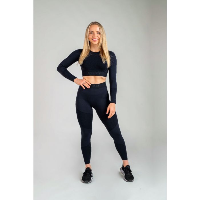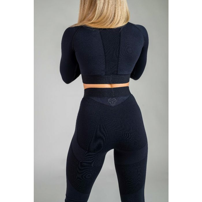 Ženski funkcionalni top Infinity je izdelan z uporabo brezšivne tehnologije in je sestavljen iz visokokakovostnega materiala, ki združuje najlon in elastan, zaradi česar je izjemno funkcionalen kos športnega oblačila, ki se prilega vsakemu telesu in zanesljivo vpija znoj. Trden pas, nameščen pod prsmi, zagotavlja, da zgornji del vedno ostane na mestu skozi celotno vadbo. Krajši kroj in dolgi rokavi so odlična kombinacija s pajkicami z visokim pasom.