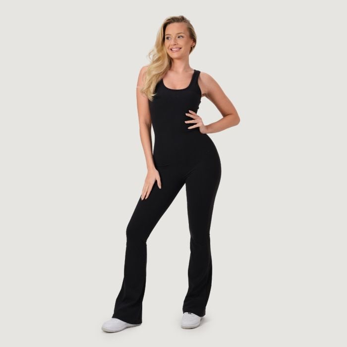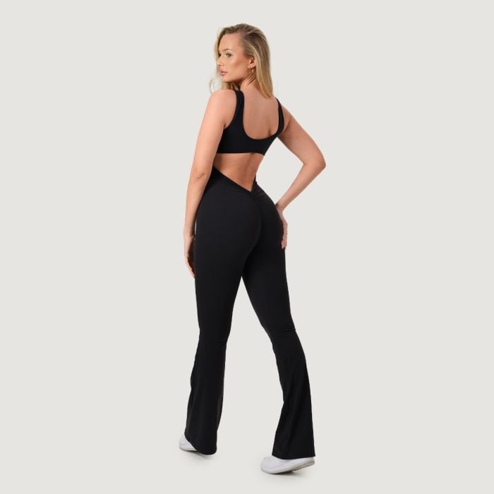 Ta športen, neprosojen kombinezon brez rokavov z okroglim vratnim izrezom izstopa s svojim dizajnom in slim fit krojem, ki se popolnoma prilagodi vaši postavi. Dolge hlačnice s priljubljenim <strong">zaključkom na zvonec optično podaljšajo noge, medtem ko scrunch butt učinek na zadnji strani čudovito oblikuje in poudari zadnjico. Odsotnost sprednjega šiva zagotavlja maksimalno udobje brez neprijetnega tiščanja.