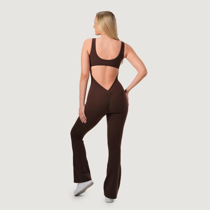 Ta športen, neprosojen kombinezon brez rokavov z okroglim vratnim izrezom izstopa s svojim dizajnom in slim fit krojem, ki se popolnoma prilagodi vaši postavi. Dolge hlačnice s priljubljenim <strong">zaključkom na zvonec optično podaljšajo noge, medtem ko scrunch butt učinek na zadnji strani čudovito oblikuje in poudari zadnjico. Odsotnost sprednjega šiva zagotavlja maksimalno udobje brez neprijetnega tiščanja.